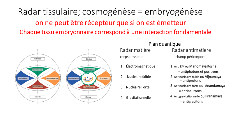 At the quantum level, the vibratory equivalence between catalyst pigments and ideograms shows the wave-particle duality : presence of vibrations of the corpuscular discontinuous matter type of the physical body, and undulatory vibrations of the continuous antimatter type of the pericorporal field.