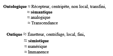 Dialogue entre l’ontologique et l’ontique, entre le sémantique et le semiotique, entre le local et le non local.