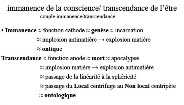 L’Immanence est genèse de la matière par implosion de l’antimatière. La transcendance est la mort ou implosion de la matière qui donne l’antimatière.