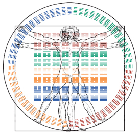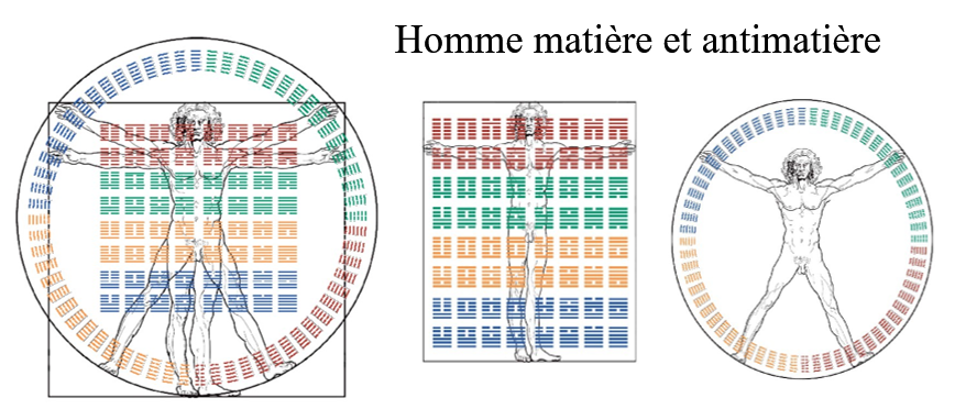 Superposition de l’homme de Vitruve et du grand tableau des hexagrammes de Fou Hi, avec le carré central terre et le cercle représentant le ciel