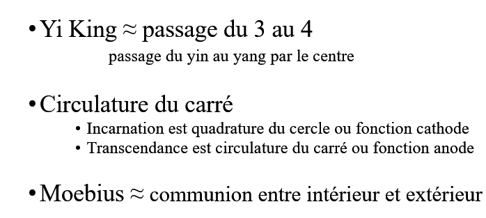Il permet de comprendre le passage du carré matière au cercle antimatière, et le passage de matière à antimatière qui est une transformation de Moebius faisant communier l’intérieur et l‘extérieur.