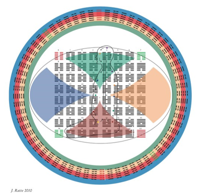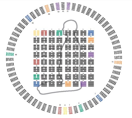 Les hexagrammes par leur double nature analogique et numérique permettent le résonance entre le cercle et le carré. Ils résonnent aussi bien avec le carré linéaire numérique qu’avec le cercle analogique. Différence de forme sémiotique mais communauté de substance sémantique.
