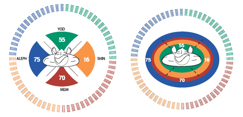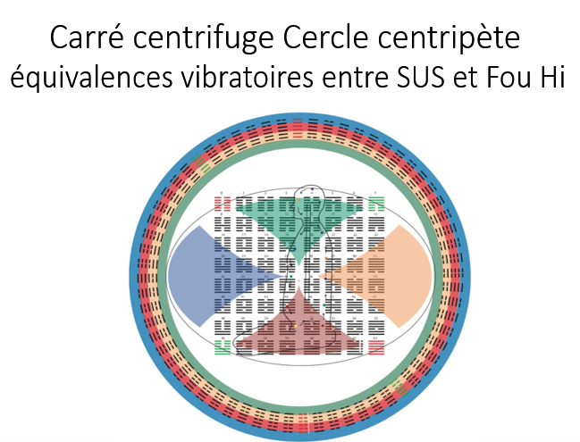 Le codage coloré permet de voir l’équivalence vibratoire entre les 4 zones de résonance pigmentaire et les 4 secteurs des hexagrammes du grand cercle de Fou Hi, à savoir vieux et jeune Yang et vieux et jeune Yin.