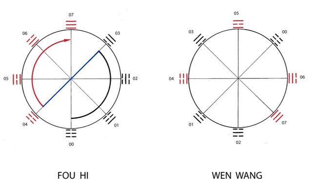 Les hexagrammes sont centrifuges et centripètes. Les hexagrammes sont couplés diamétralement pour toujours avoir un équilibre yang et yin, Équilibre continu yang et discontinu yin.