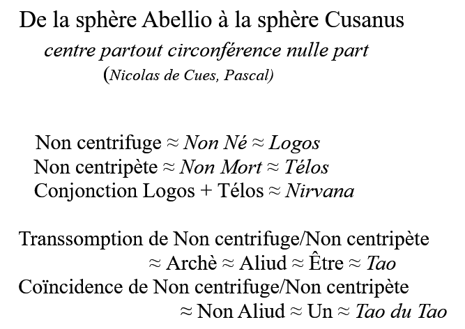 Transsomption est l’opérateur qui fait franchir tous les niveaux jusqu’au centre de la sphère infinie dont le centre est partout et la circonférence nulle part selon Thierry de Chartres et Nicolas de Cues ( 2)